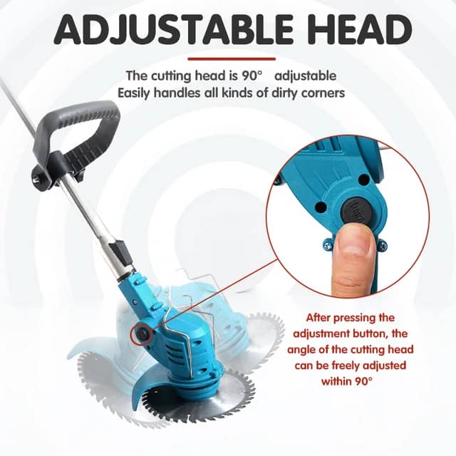 The portable lawn mower features a multi-angle adjustable cutting head, making it ideal for a variety of tasks from cutting to trimming to landscaping. The convenience of an angle adjustment button adds flexibility, allowing you to easily tackle different terrains and gardening challenges.